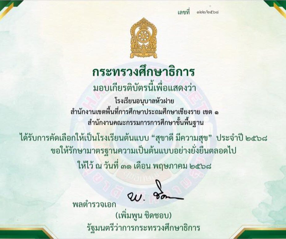 | โรงเรียนอนุบาลหัวฝาย ได้รับการคัดเลือกเป็นโรงเรียนต้นแบบ “สุขาดี มีความสุข” (Happy Toilet) ประจำปี 2568 จากสำนักงานคณะกรรมการการศึกษาขั้นพื้นฐาน (สพฐ.) |