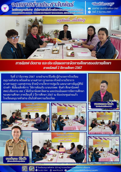 ฉบับที่ 62/2567 วันที่ 17 ธ.ค. 67 นิเทศ ติดตาม และประเมินผลการจัดการศึกษาของสถานศึกษา ภาคเรียนที่ 2 ปีการศึกษา 2567