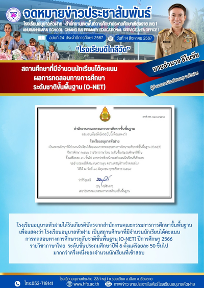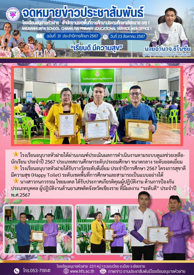 ฉบับที่ 31/2567 วันที่ 23 ส.ค. 67 รับเกียรติบัตรรางวัล จากผู้อำนวยการสำนักงานเขตพื้นที่การศึกษาประถมศึกษาเชียงราย เขต 1