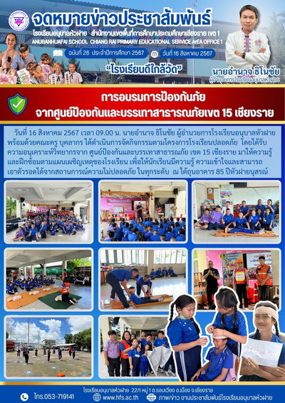 ฉบับที่ 26/2567 วันที่ 16 ส.ค. 67 การอบรมป้องกันภัย จากศูนย์ป้องกันภัยและบรรเทาสาธารณภัย เขต 15 เชียงราย