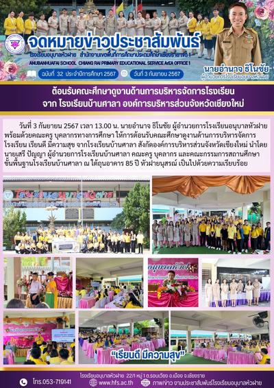 ฉบับที่ 32/2567 วันที่ 3 ก.ย. 67 ต้อนรัรบคณะศึกษาดูงานด้านบริหารจัดการสถานศึกษา จากโรงเรียนบ้านศาลา อบจ.เชียงใหม่