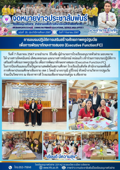 ฉบับที่ 35/2567 วันที่ 7 ก.ย. 67 การอบรมปฏิบัติการเสริมสร้างศักยภาพครูปฐมวัย เพื่อพัฒนาทักษะทางสมอง (Executive Function : FC)