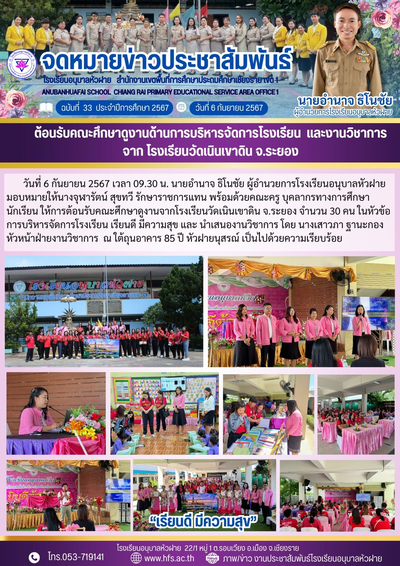ฉบับที่ 33/2567 วันที่ 6 ก.ย. 67 ต้อนรับคณะศึกษาดูงานด้านบริหารจัดการ และวิชาการ จากโรงเรียนวัดเนินเขาดิน จ.ระยอง