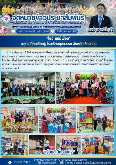 ฉบับที่ 34/2567 วันที่ 6 ก.ย. 67 "โชว์ แชร์ เชื่อม" แลกเปลี่ยนเรียนรู้ โรงเรียนคุณธรรม จังหวัดเชียงราย