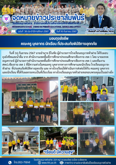 ฉบับที่ 36/2567 วันที่ 16 ก.ย. 67 มอบถุงยังชีพ คณะครู บุคลากร นักเรียน ที่ประสบภัยพิบัติทางอุทกภัย