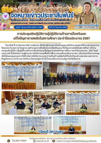 ฉบับที่ 38/2567 วันที่ 22 ก.ย.67 การประชุมเชิงปฏิบัติการผู้ปฏิบัติงานด้านการป้องกันและแก้ไขปัญหายาเสพติดในสถานศึกษา 2567