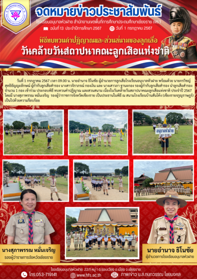 ฉบับที่ 13/2567 วันที่ 1 ก.ค.67 พิธีทบทวนคำปฏิญาณและสวนสนามของลูกเสือ เนื่องในวันคล้ายวันสถาปนาคณะลูกเสือแห่งชาติ