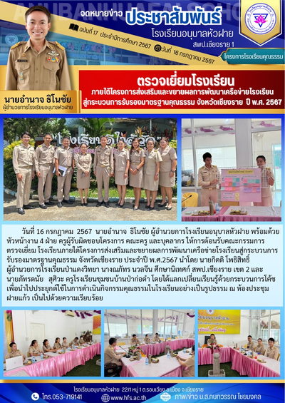 ฉบับที่ 16/2567 วันที่ 16 ก.ค.67 ตรวจเยี่ยมโรงเรียนภายใต้โครงการส่งเสริมและขยายผลการพัฒนาเครือข่ายโรงเรียนสู่กระบวนการรับรองมาตรฐานคุณธรรม จังหวัดเชียงราย ปี 2567