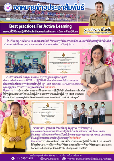 ฉบับที่ 21/2567 วันที่ 1 ส.ค.67 Best parctices For Active Learning ผลงานที่มีวิธีการปฏิบัติที่เป็นเลิศ ด้านส่งเสริมและการจัดการเรียนเชิงรุก